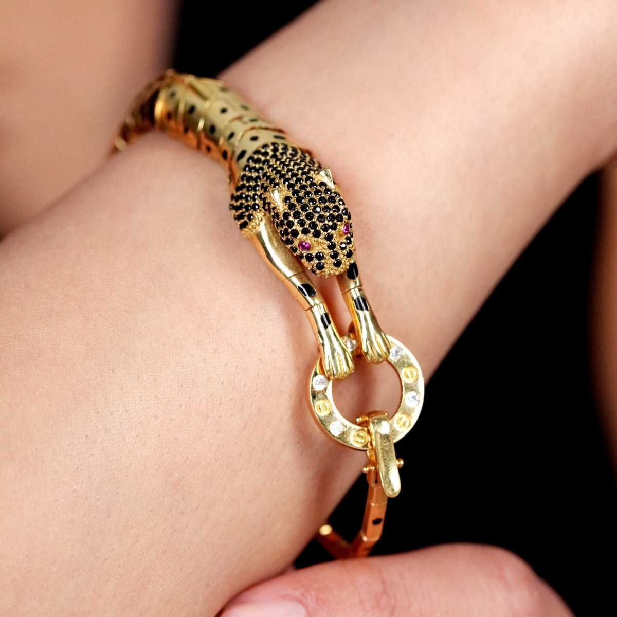 Güçlü leopar figürü ve beyaz taş detaylarıyla öne çıkan Beyaz Taşlı Leopar Bileklik, cesur ve dikkat çekici bir stil sunar. Leopar motifinin simgelediği güç ve zarafet, bilekliğe karakteristik bir duruş kazandırır.