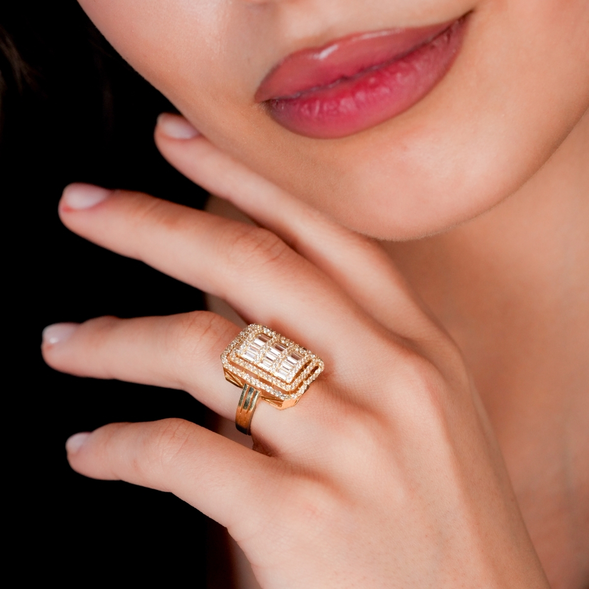 Merkezde yer alan büyük taş, ışığı etkileyici şekilde yansıtarak parmağınızda güçlü bir duruş sergiler. Özel davetlerde, nişan ve şık kombinlerde tercih edilebilecek bu model, zarafeti ön plana çıkarmak isteyenler için ideal bir seçimdir.