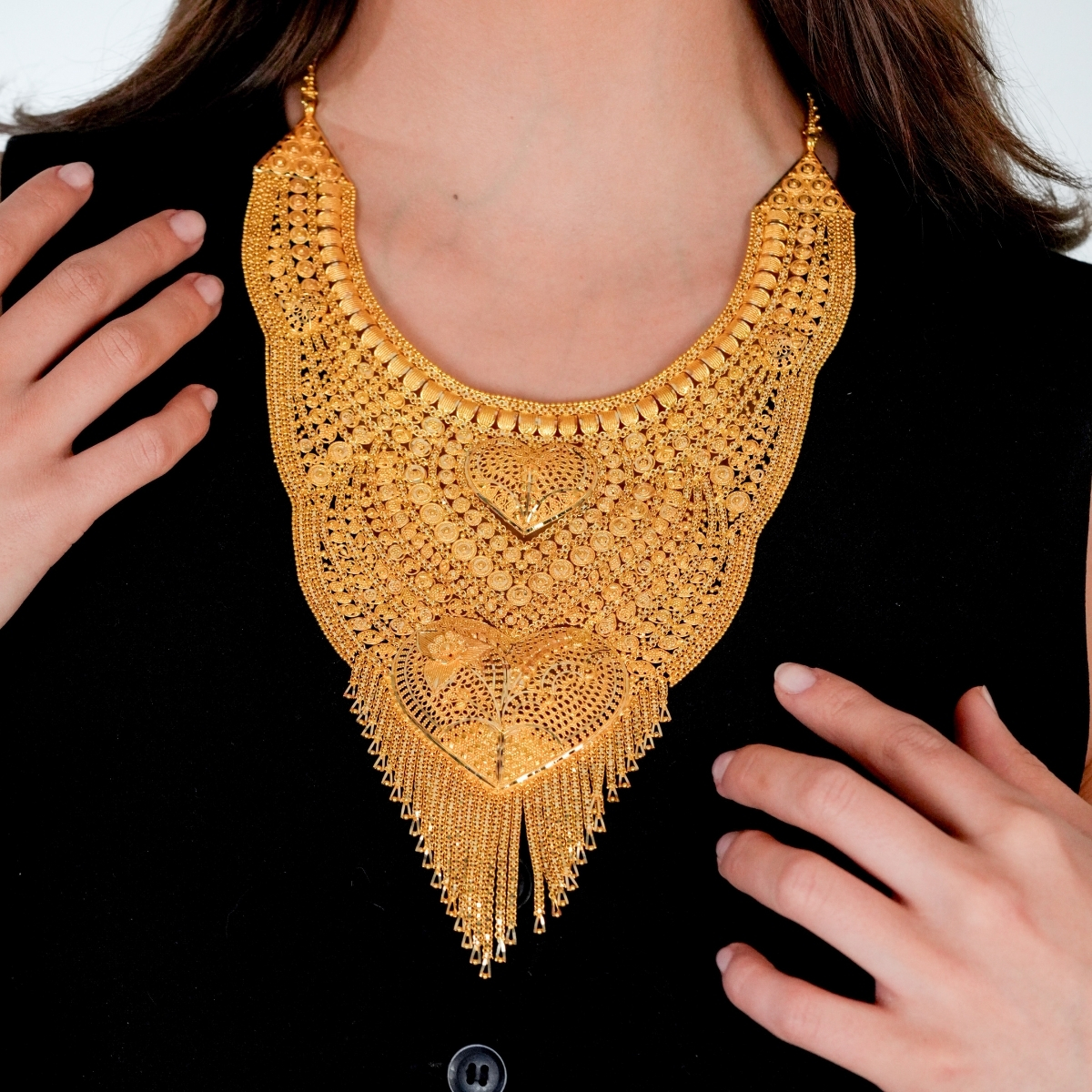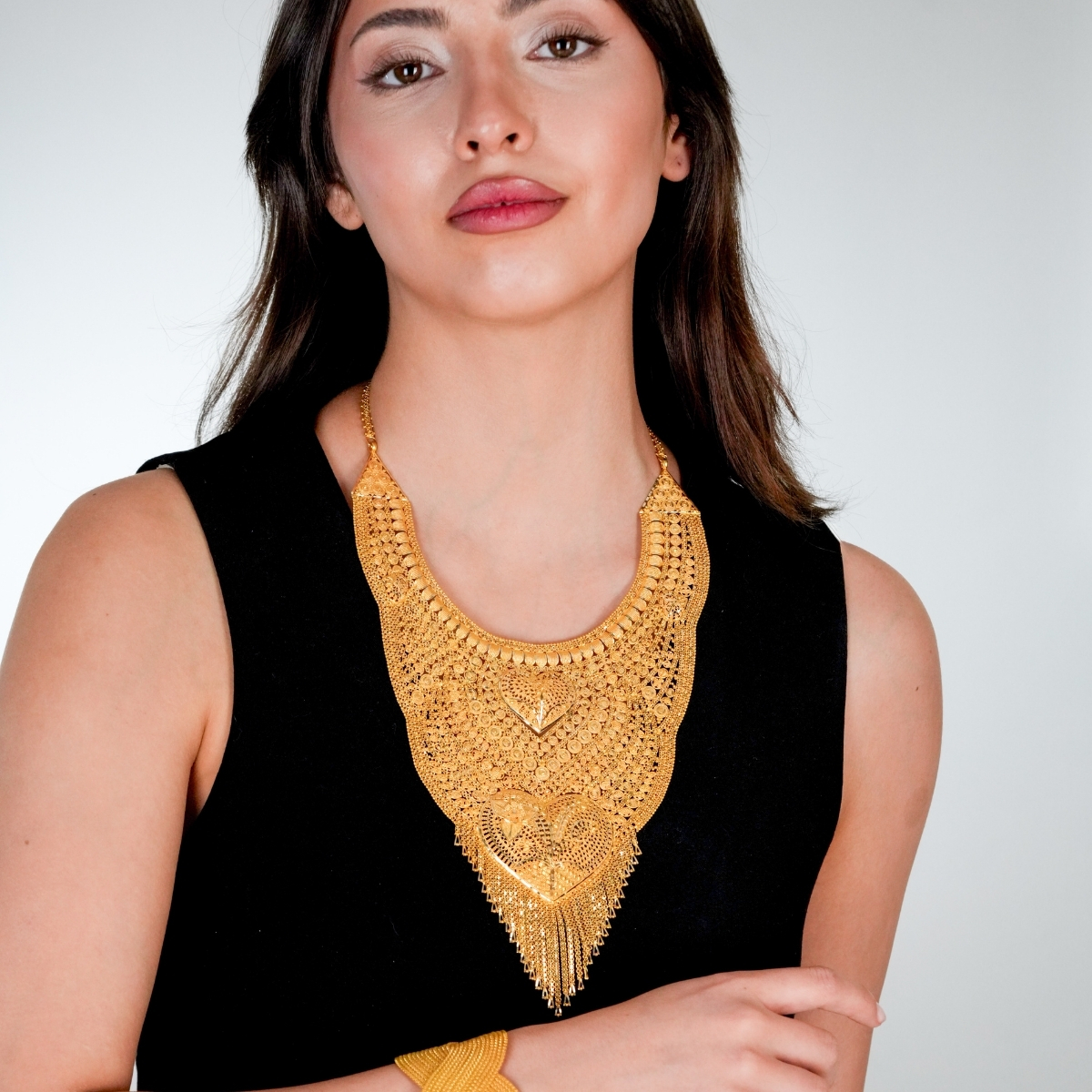Set parçaları birbiriyle uyumlu olacak şekilde tasarlanmış olup, özellikle düğün, nişan ve davet kombinlerinde şıklığı tamamlar. Gerdanlık formunun sağladığı dolgun ve dengeli duruş, sete klasik ama güçlü bir karakter kazandırır.