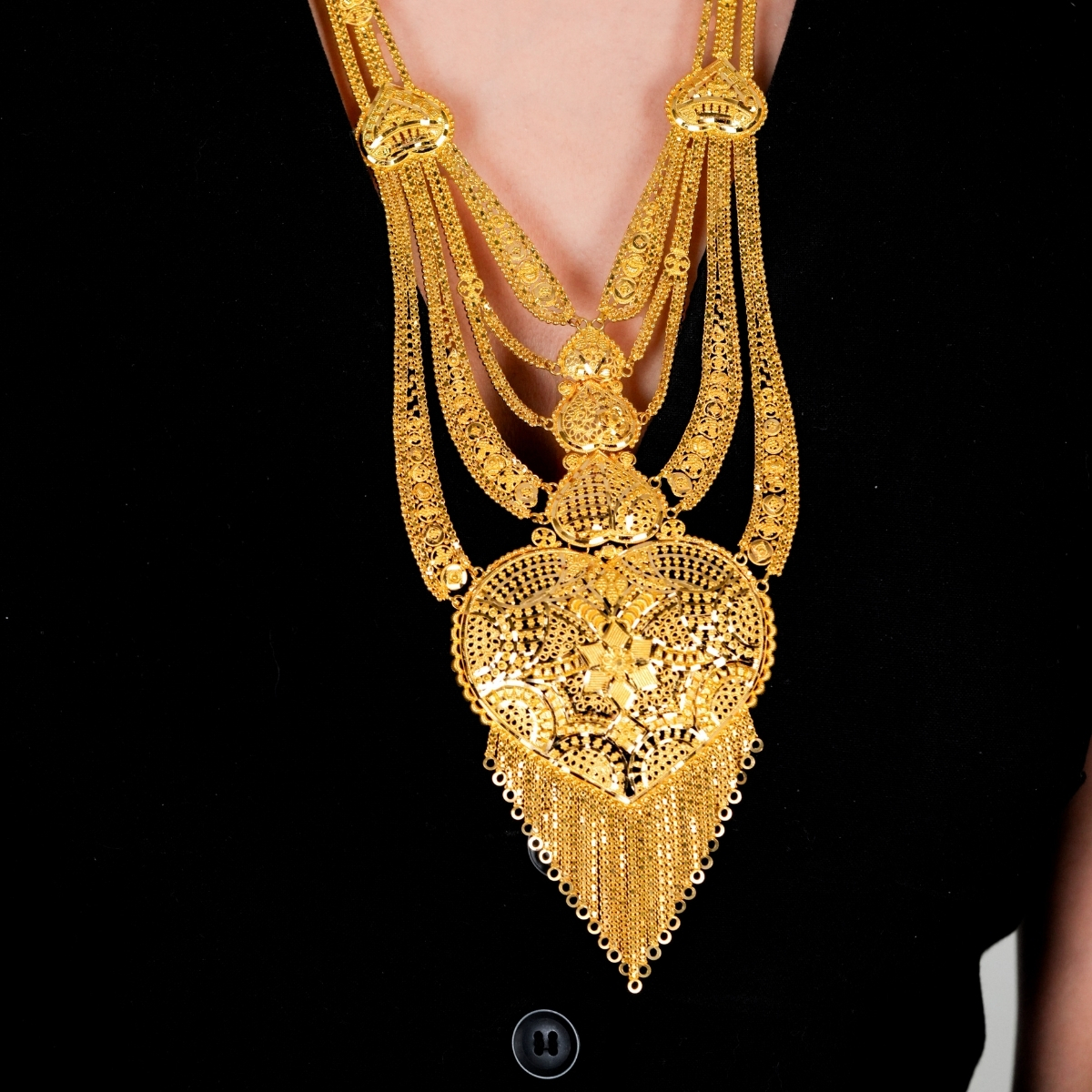 Set içerisindeki parçalar uyumlu bir tasarıma sahiptir ve boyun ile dekolte hattında etkileyici bir görünüm oluşturur. Hint esintili detaylar, sete hem kültürel bir zenginlik hem de zamansız bir şıklık kazandırır. Özel günlerde tercih edilebileceği gibi, koleksiyonunda iddialı takılar bulundurmak isteyenler için de ideal bir seçimdir.