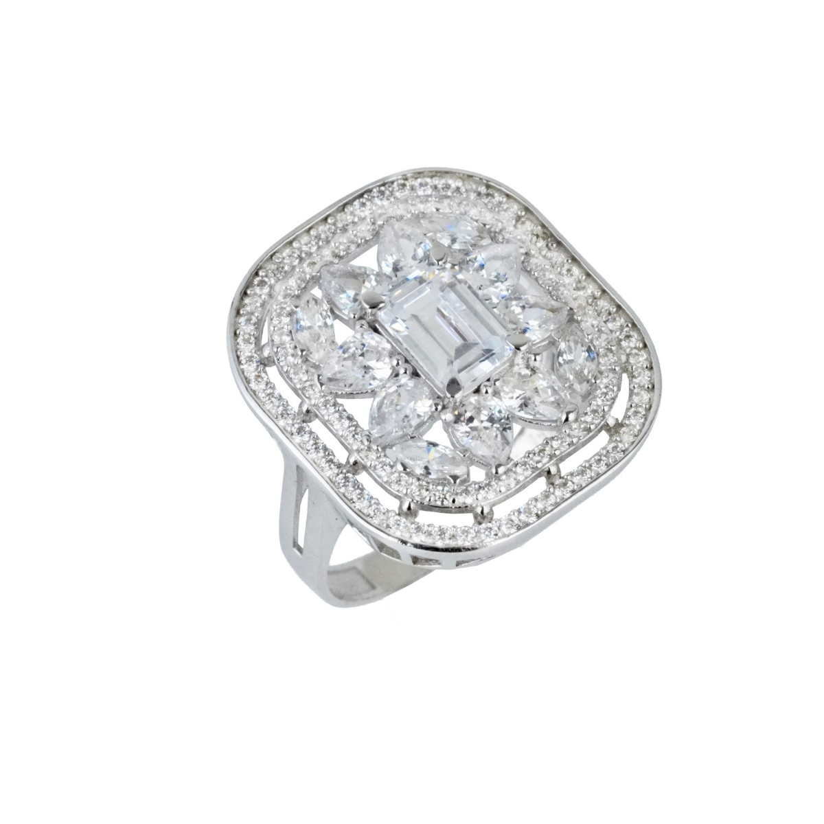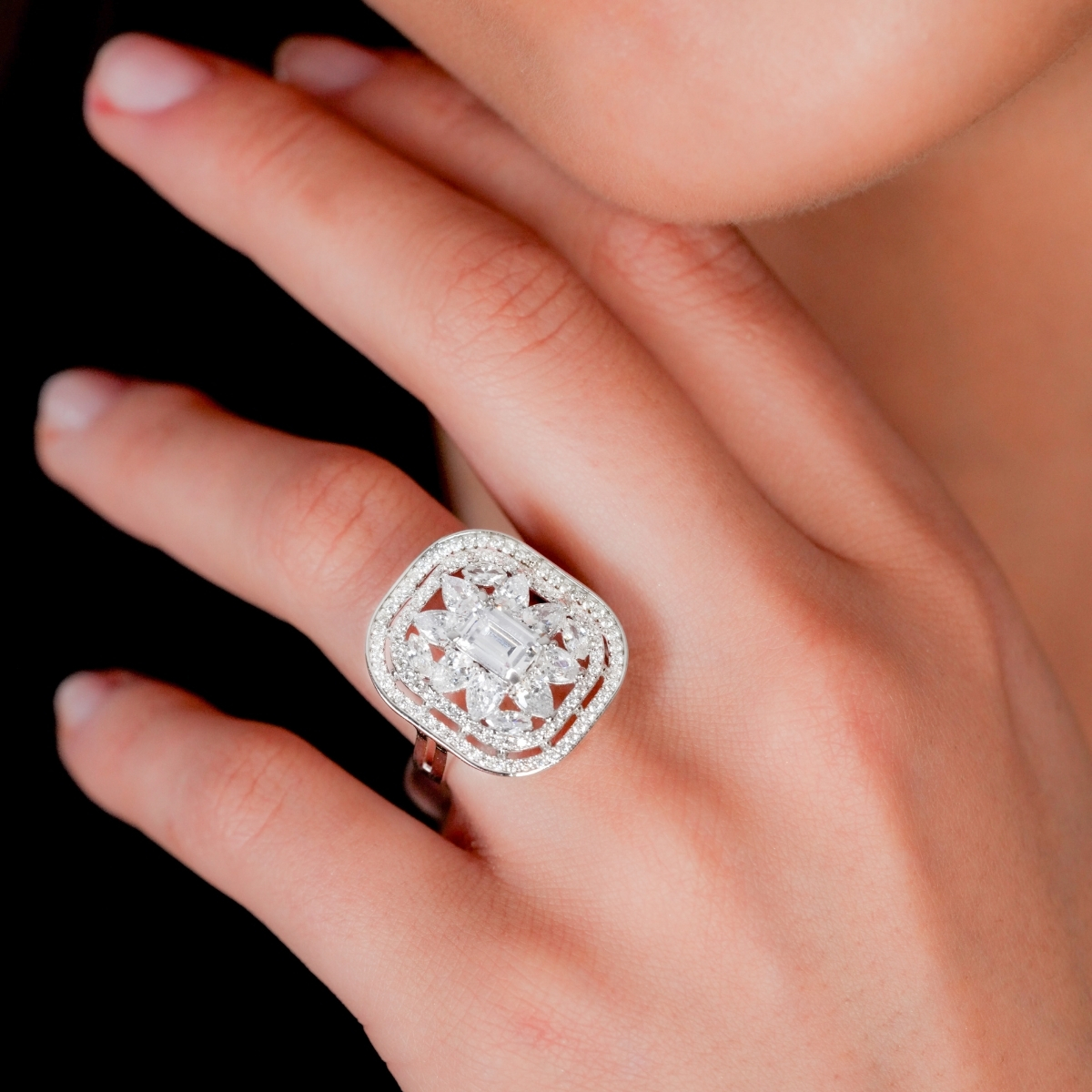 Merkezde konumlanan baget taş, dört köşe pırlantalarla çevrelenerek parmak üzerinde güçlü ve dengeli bir duruş sergiler. Özel davetlerde, nişan ve anlamlı günlerde tercih edilebilecek bu model, klasik şıklığı modern detaylarla tamamlar.