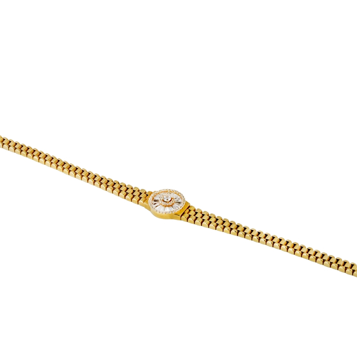 Zarif detayları ve modern duruşuyla dikkat çeken Altın Baget Taşlı Kelepçe, şıklığı güçlü bir tasarımla birleştiren özel bir aksesuardır. Baget kesim taşların düzenli ve net formu, kelepçeye sofistike bir görünüm kazandırırken altının doğal ışıltısı ile kusursuz bir uyum yakalar.