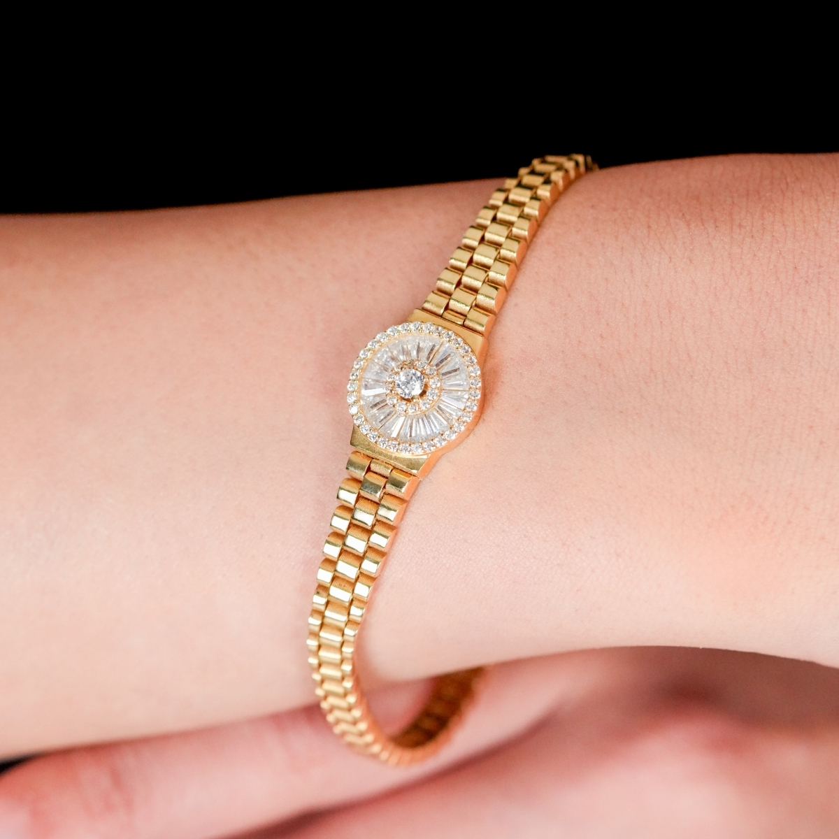 Kelepçe formu sayesinde bilekte şık ve dengeli bir duruş sergileyen bu model, hem günlük kullanımda hem de özel davetlerde rahatlıkla tercih edilebilir. Baget taşların ışığı etkili şekilde yansıtması, bileziğe her açıdan göz alıcı bir parlaklık katar.