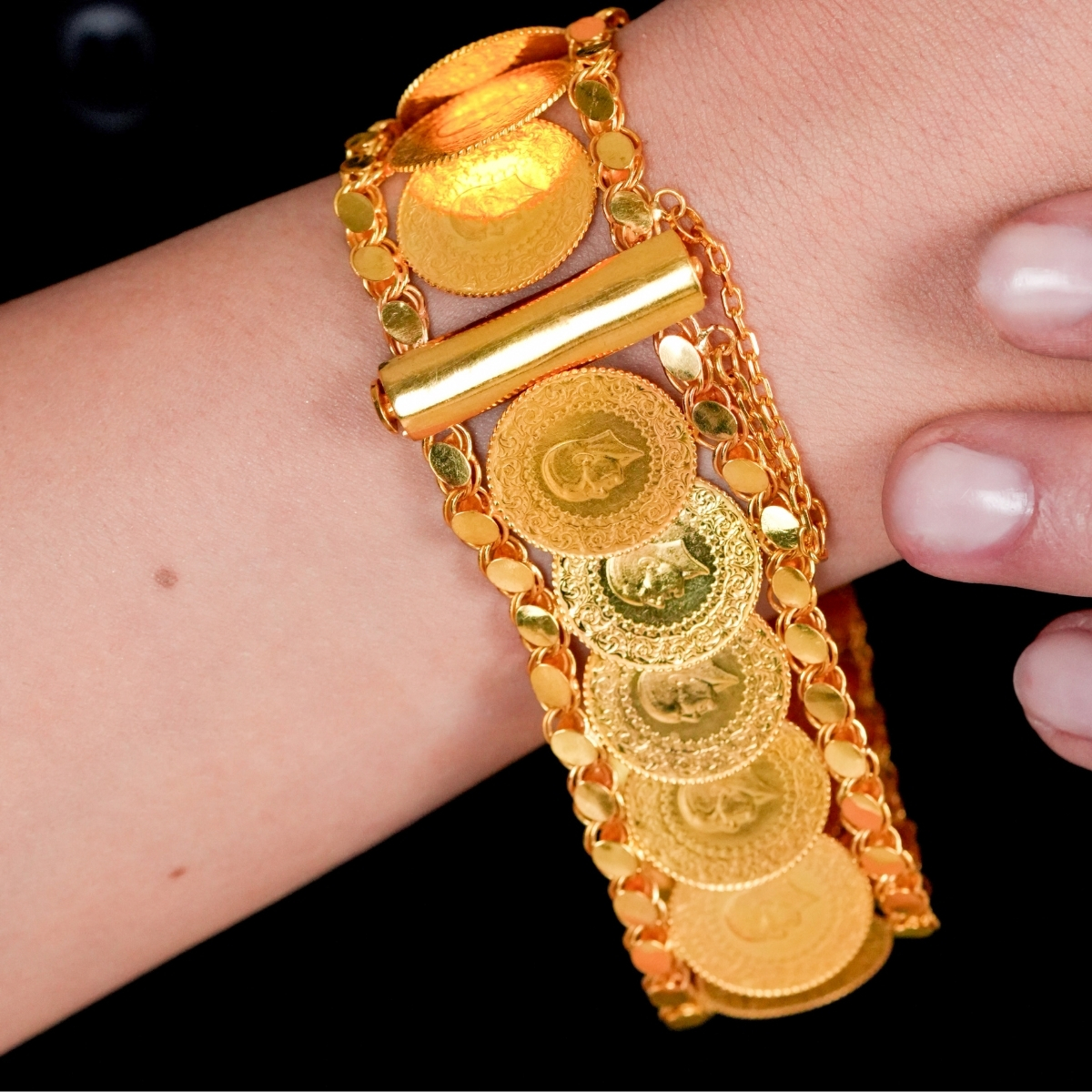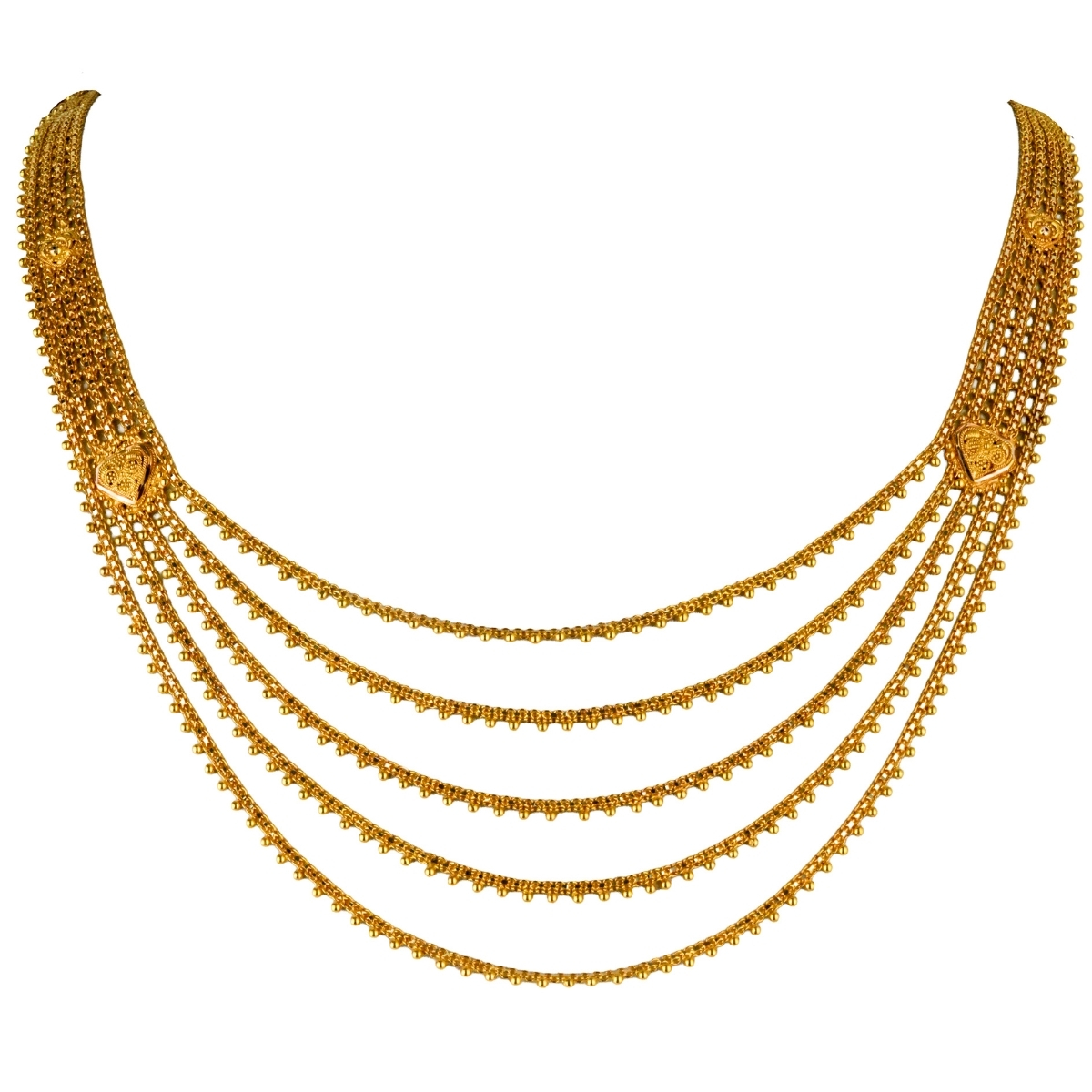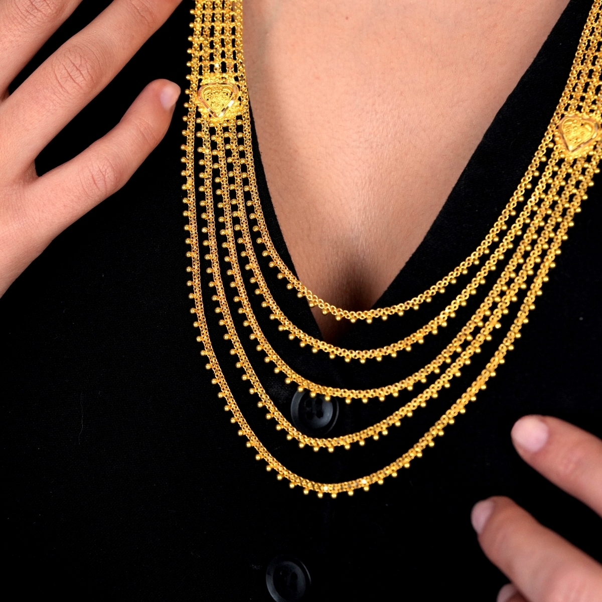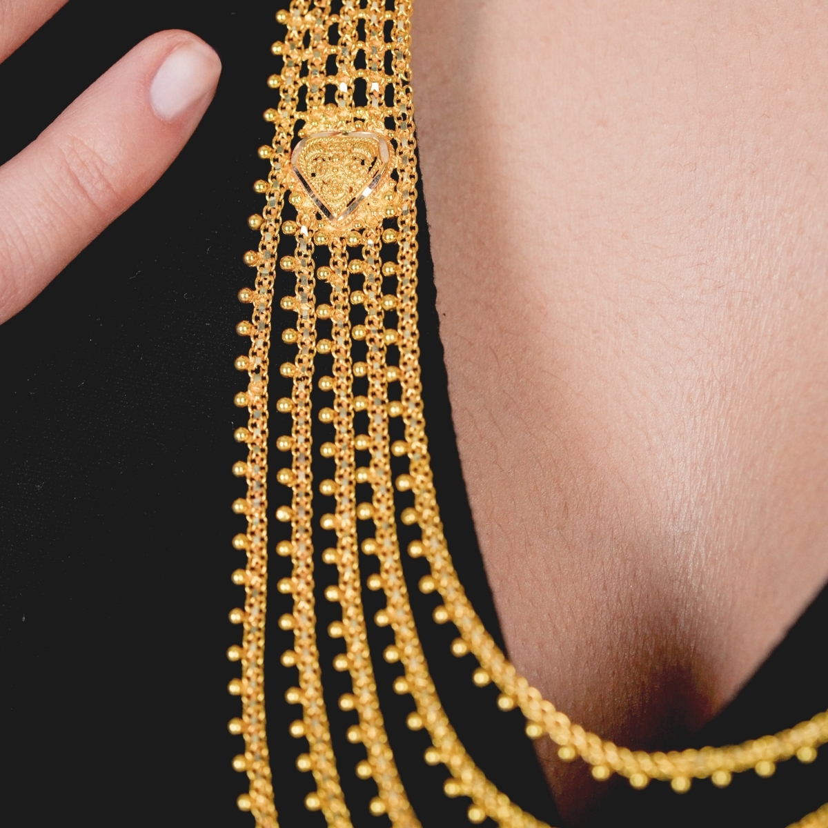 Geleneksel Hint işçiliğinin zarif detaylarını taşıyan Sıralı Hin İşi Altın Set, katmanlı tasarımıyla dikkat çekici ve gösterişli bir görünüm sunar. Sıralı formu sayesinde boyun hattında dolgun ve dengeli bir duruş sağlar.