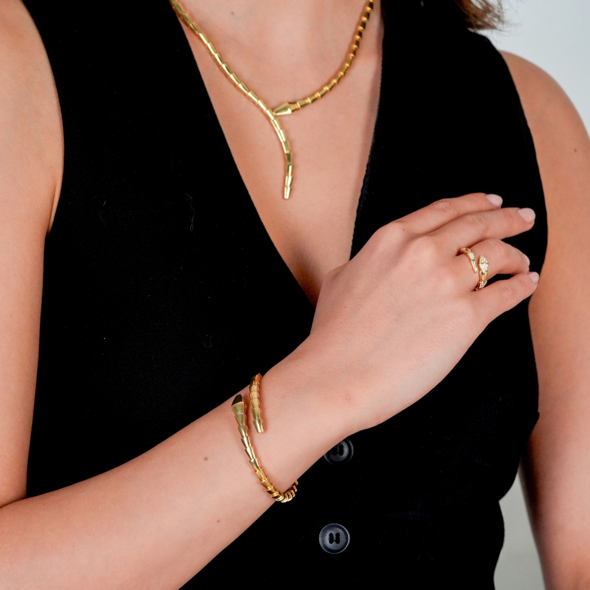 Kaliteli altın işçiliğiyle üretilen Yılan Desenli Set, uzun ömürlü kullanım sunar ve değerini korur. Kendiniz için farklı ve dikkat çekici bir tamamlayıcı ya da sevdiklerinize anlamlı bir hediye alternatifi olarak tercih edilebilir.